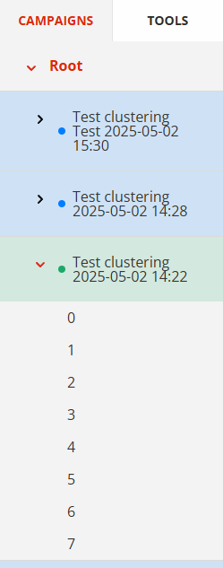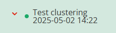 * **Categories in production mode (`Run`):** For example, a clusterization that is active and exports data daily is marked in <mark style="color:green;">green</mark>.